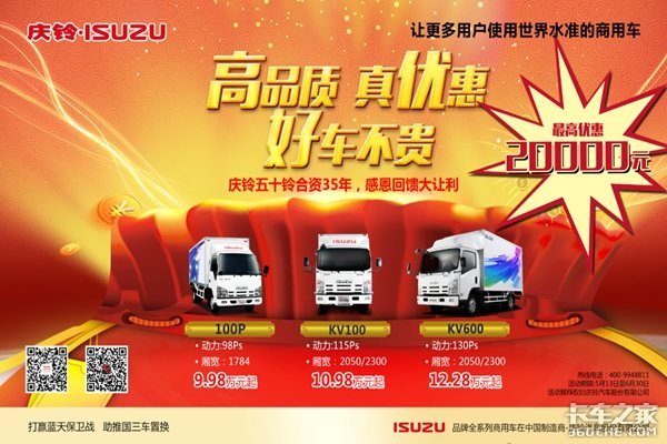【卡车之家 原创】五月,夏未至春已末,除了母亲节外,也正好恰逢庆铃、五十铃合资合作35年重要时刻,在这个充满感恩的月份,庆铃汽车为感恩客户长期以来对庆铃汽车的信赖与支持,携旗下100P/KV100/KV600等明星轻卡车型开展了以“高品质、真优惠、好车不贵”为主题的系列产品促销活动,用超值钜惠来帮用户创造幸福生活。