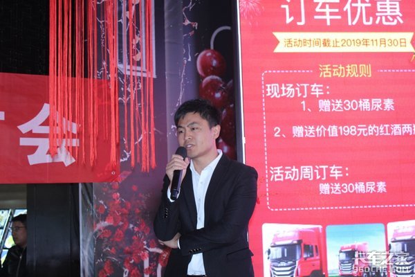 山西前进运力汽车销售有限公司销售总监边海军先生做推广产品介绍,此次主要推出的车型为4X2的,玉柴4缸200马力,重汽10档箱,后桥8吨,6X2的,锡柴6缸290马力。法士特9档,后桥459。