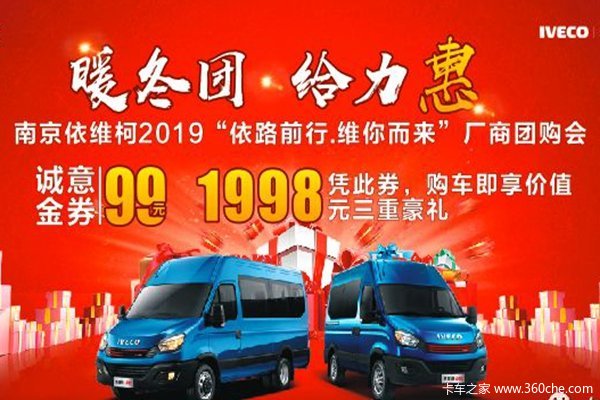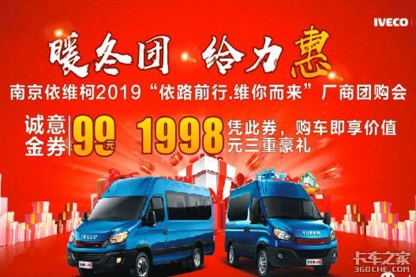 【卡车之家 原创】12月21日(本周六),在苏州都灵依维柯4S店举办 2019“依路前行 维你而来”厂商团购会,预存99元诚意金,即享价值1998元三重豪礼名额有限先到先得,99抵1998元三重豪礼。