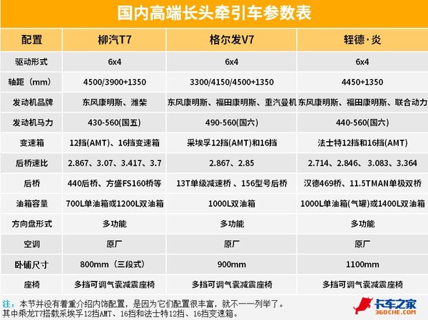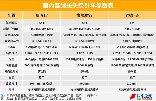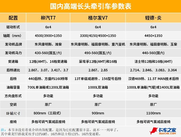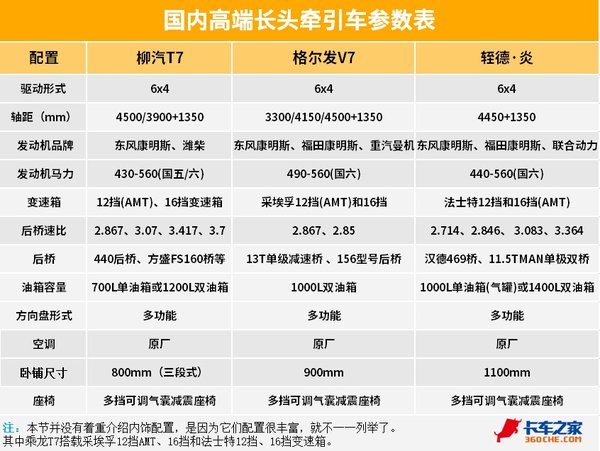 总结:三个品牌车型都拥有着同质化的动力链,并且配置也越来越高级,同属大马力、大空间和高配置车型。目前,三者中只有乘龙T7已上市销售,而格尔发V7和轾德·炎暂时处于未上市状态,对于它们三个而言,众位卡友你们更喜欢哪一个?
