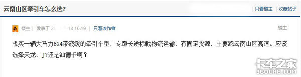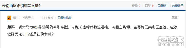 本期文章卡友的购车需求为:咨询购买一辆大马力6X4带液缓的牵引车型,工况条件为专跑长途标载物流运输,路况以云南山区高速为主。