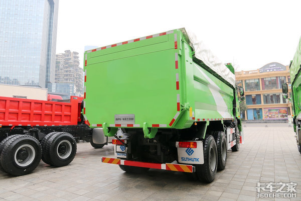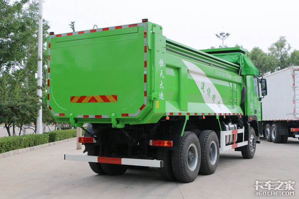 货厢可选择5.6米长货厢,为该级别主销的货厢长度。另外配以5.26以上的车辆总速比,加上380马力发动机,当发动机1300转/分时,最高挡车速处于50km/h左右时,符合城市渣土车行驶速度要求。