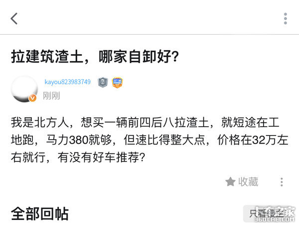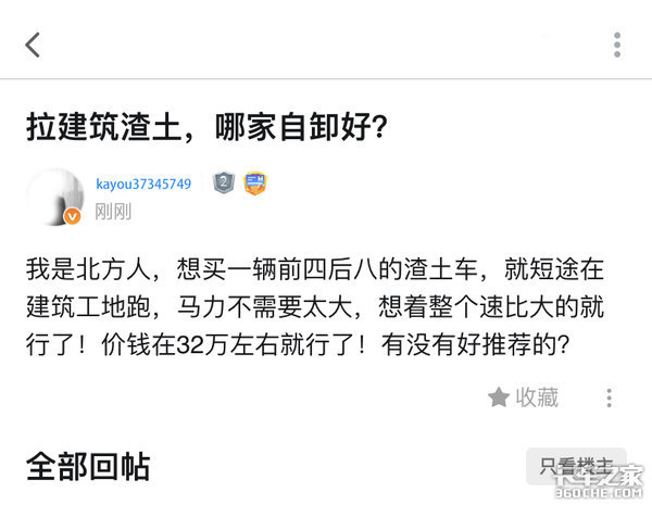 本期文章卡友的购车需求为:咨询购买一辆6X4自卸渣土车型,工况条件为北方建筑工地内部运输,带有少许泥泞路段和爬坡路段,主要为短途渣土运输,价格32万左右,额外要求是马力在380左右,但是要大速比。