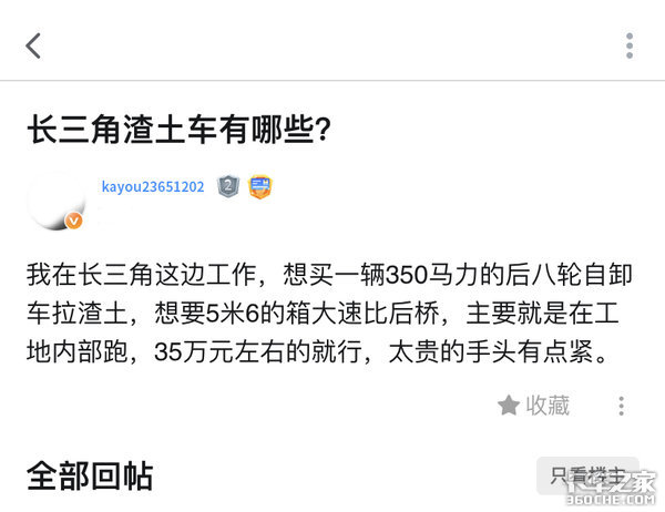 本期文章卡友的购车需求为:咨询购买一辆350马力的6X4大速比5.6米自卸车型,路况条件为长三角地区建筑工地内部,主要为渣土运输,价格在35万元左右。