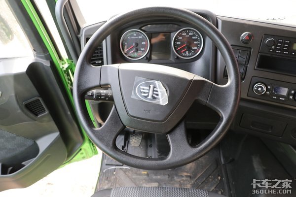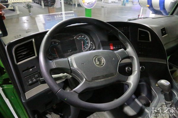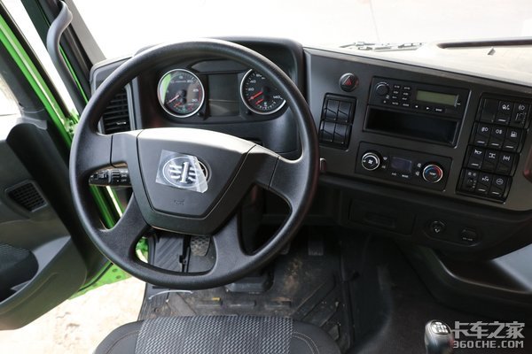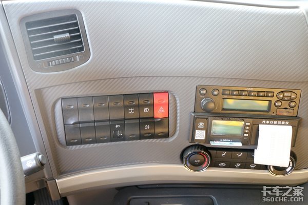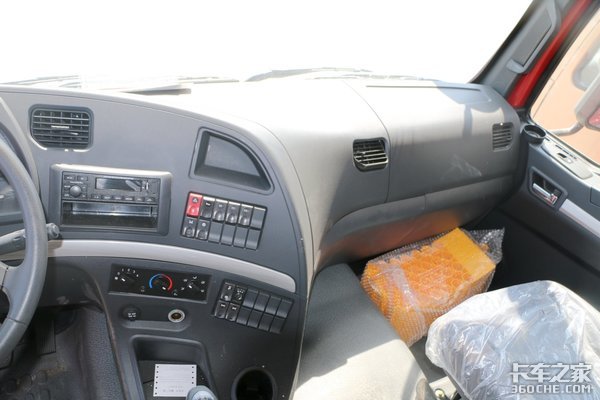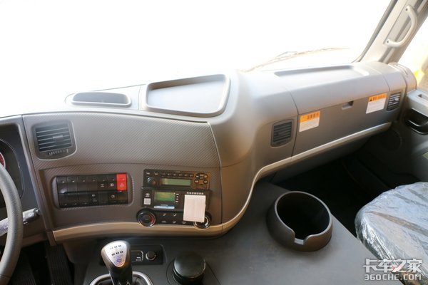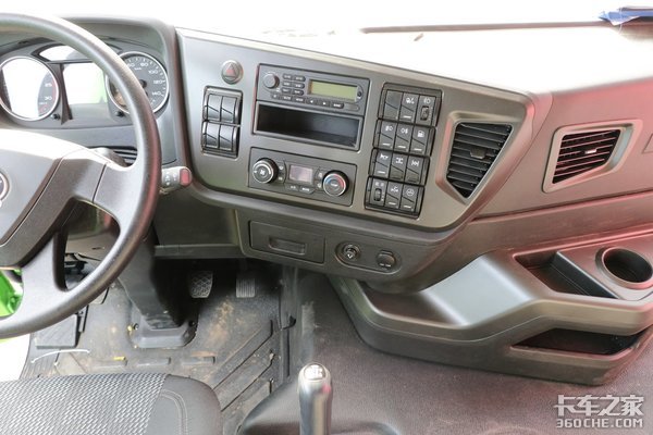 驾驶式风格基本与普通天龙保持一致,但新增了隔音材料,保证了驾驶员的舒适性。中控采用了环抱式设计,保证驾驶员的操作便利性。中控部分布局清晰合理,各个功能区域划分清晰,行驶记录仪布置在更靠近驾驶员的地方,同时也可以选装智能行驶记录仪,保证车队更加方便的管理。