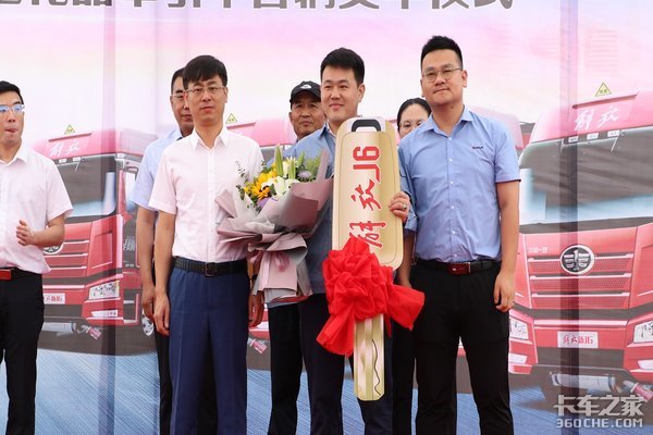 一汽解放汽车有限公司产品管理部牵引品系经理于广江为山东顺华物流有限公司总经理王飞递送交车金钥匙