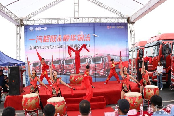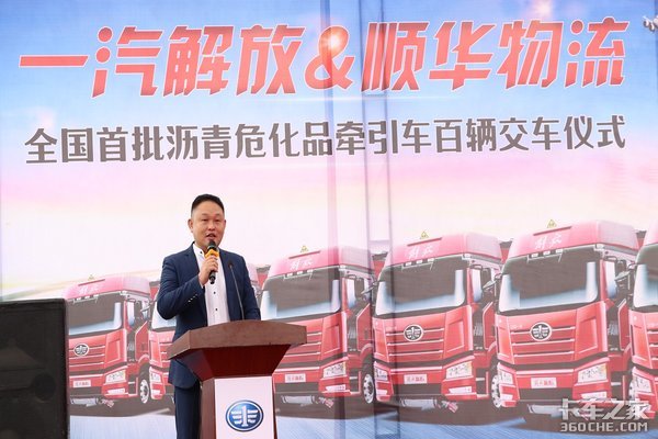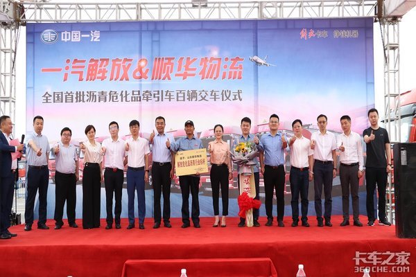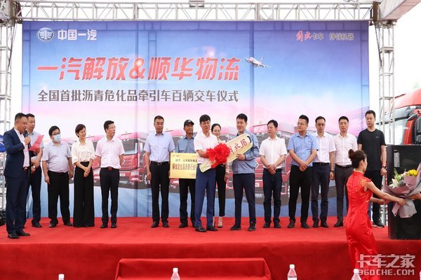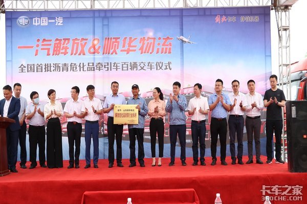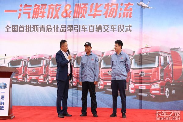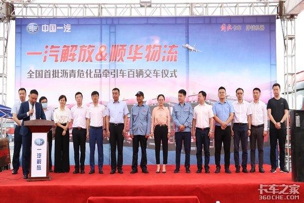 【卡车之家 原创】晴日暖风生麦气,绿阴幽草胜花时。今天我们共同的相聚在宝达集团这片金色的沃土地上,共同迎来一汽解放与顺华物流全国首批沥青危化品牵引车百辆交车仪式。