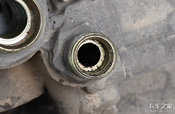再来看制动气压的输出口,这里能看到油污,说明空压机出现了“烧机油”现象,空压机的润滑油已经顺着气流进入到ABS阀内。