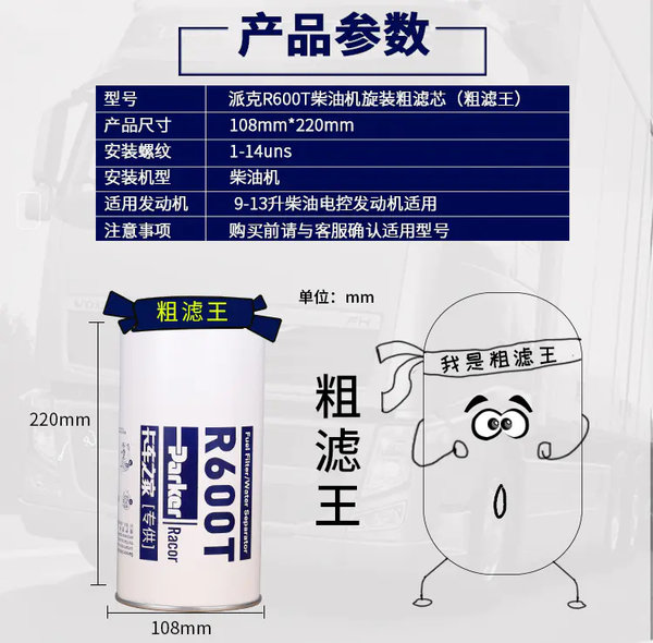 这款派克粗滤具体型号为R600T,过滤精度达到10微米,仅为头发丝的50分之1,能够过滤掉柴油中对发动机有害的杂质,适合9-13升发动机使用。