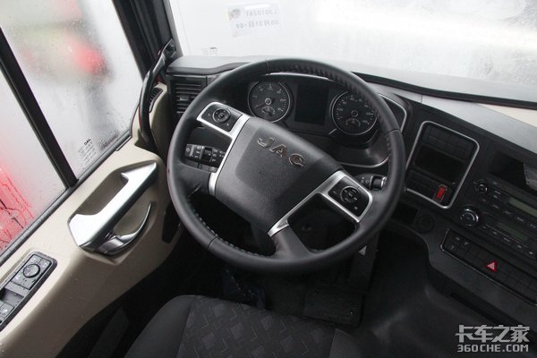 江淮格尔发A5XⅢ的驾驶室可以称得上是整车亮点,高顶双卧铺平地板设计,储物空间和休息区表现自然无需多言。并且向多功能方向盘、定速巡航、后视镜电调电加热、气囊座椅等舒适性配置都在这台格尔发A5XⅢ上有配备。