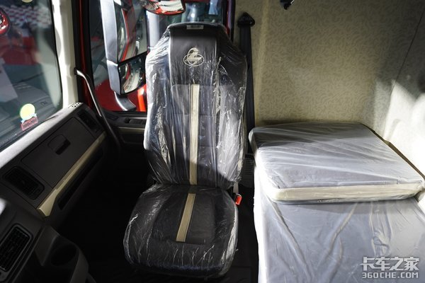 深色的内饰颜色,抗污性更好,中控台区域布置位置偏向于主驾,驾驶员伸手便可操作。高顶双卧驾驶室的设计很好解决了两人同时休息的问题,值得一提的是,副驾驶座椅可以进行180°旋转,搭配车上的卧铺坐垫,下铺秒变“大床房”。