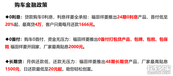 访谈中提到,受疫情影响,许多卡友购车压力骤增,本着为卡友服务的态度,福田祥菱特推出“0利息 0首付 长期贷”的购车优惠活动。选择0首付,厂家最高贴息2000元;选择长期贷,厂家最高贴息1500元,日还款低至20元起。