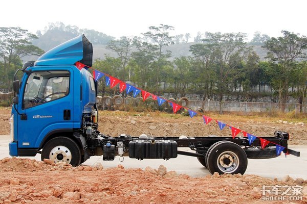 匹配5挡手动变速箱;底盘为前7后8+5钢板弹簧结构,前桥允许载荷达到3180,后桥允许载荷达到5580kg,速比,5.571,可搭载4200x2380x400mm栏板式货箱。