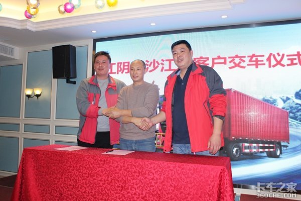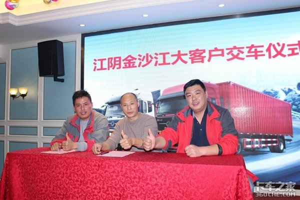 江阴市金沙江总经理蔡燃先生、江阴市金沙江销售经理张林飞先生与江阴茂盛物流有限公司薛总进行了订车签约仪式