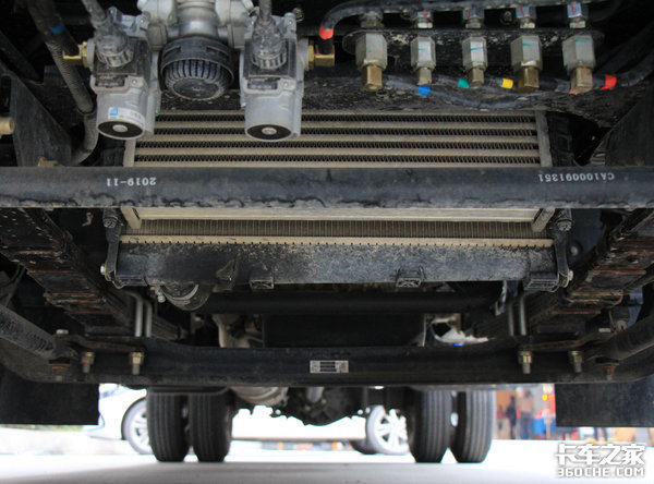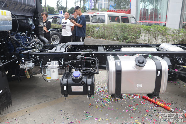 新统帅在车辆的左侧布局了干燥罐、柴油滤芯、尿素罐以及铝合金油箱。干燥罐布局在车架外侧,这样检查和维护更加方便。在车架右侧,新统帅布置了电瓶,在电瓶旁边其留出了不少的空间,改装比较方便。