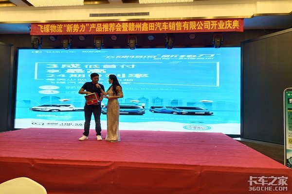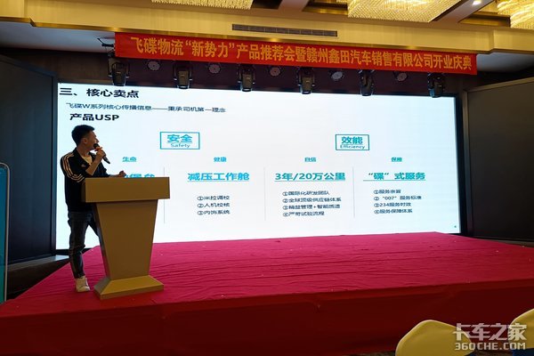 12点10分,飞碟汽车产品经理鞠疆榕先生上台致辞作产品介绍,首先是感谢大家的到来与支持。飞碟汽车在同行业内有个最大的亮点就是把乘用车的安全性与舒适性融入到商用车产品中,所以它在外观颜值和安全舒适性上有着绝对优势!目前推出的都是国六新品,上牌无忧,合法合规,致力于打造高端轻卡及微卡系列车型。飞碟W系列核心传播信息——秉承司机第一理念,开创性的打造移动堡垒、减压工作舱的理念。飞碟汽车在售后服务方面也很到位:在行业内首个提出3年或20万公里整车超长质保(消耗品随车附件等除外)。质保价值高:整车最高核心部件4年不限里程,在质保期内维修不花钱,享有碟式服务,24小时全时为您服务,007服务标准。厂家还推出实惠金融方案:可0息定额融,低息融。利息很低,厂家还会出一部分利息,把真正的实惠给到用户。敢承诺、能兑现、真品牌——尽在飞碟汽车。谢谢大家捧场聆听。