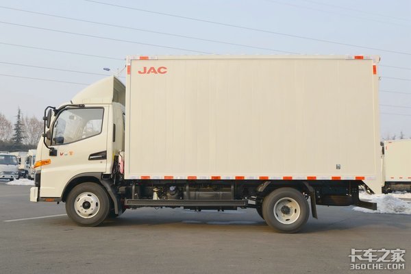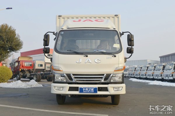 促销车型信息:江淮骏铃V5 129马力 4.15米单排厢式轻卡;该车搭载国五福田康明斯ISF2.8s5129T发动机,2.78L排量,最大输出功率96kW(129马力),扭矩300N·m;匹配5挡六安LC5T28变速箱,前后桥允许载荷分别为1620KG、2875KG,速比为4.875,弹簧片数为5/4+3;轮胎型号为7.00R16LT。