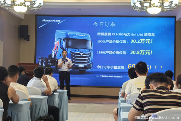 活动期间公布的定价策略引发热烈反响:欧曼星翼K13-500马力1000L气罐牵引车型30.2万元起,1350L长续航版本30.8万元起。叠加现场6000元直降优惠,实际成交价下探至29.6万元区间,较同类竞品价格优势达8%。据会后统计,仅午宴期间即达成意向订单23台。