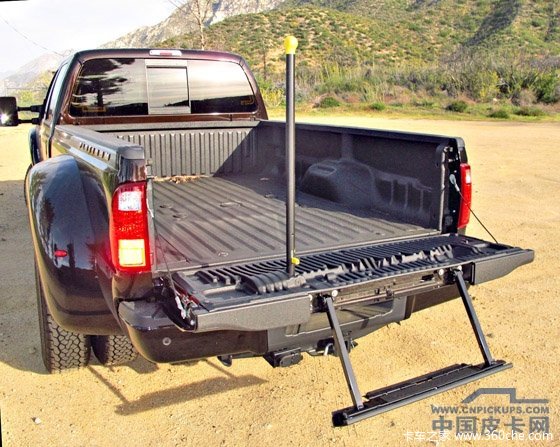 当皮卡更高更大以后,后保险杠式台阶变得捉襟见肘。福特率先推出了便于攀爬的的尾门台阶。这种台阶集成在尾门内,当尾门打开的时候,折叠在尾门内的台阶可以放下。