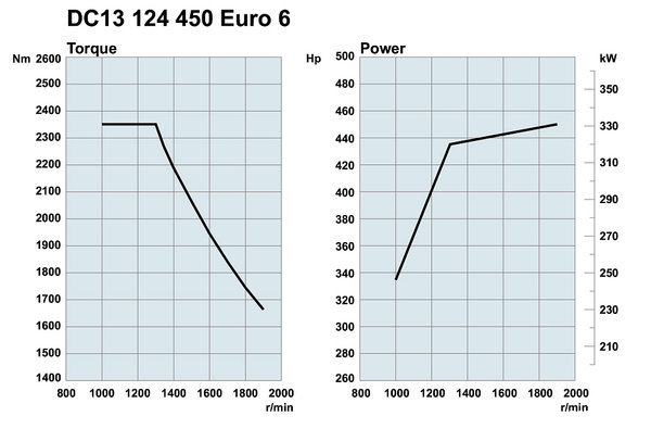 新推出的13升450马力生物柴油发动机在转速为1,000转/分时即可提供最大扭矩2,350牛米,而490马力发动机在转速为1,000-1,300转/分时提供的超强扭矩可达2,550牛米。值得一提的是,当发动机使用100%纯生物燃油时,最大输出功率仅下降8%(由于生物柴油蕴含能量较低)。