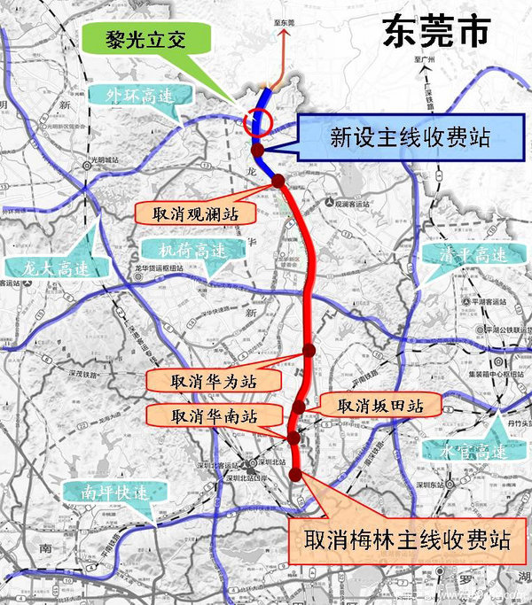 梅观高速公路起于深圳梅林关口,止于深圳和东莞边界。设置了梅林、华南物流、坂田、华为、观澜5个收费站,从梅林至观澜,全路段为7元,中间路段出口则从2元至4元不等。4月1日起,这个路段取消收费,并撤销梅林、华为、观澜等5个收费站。