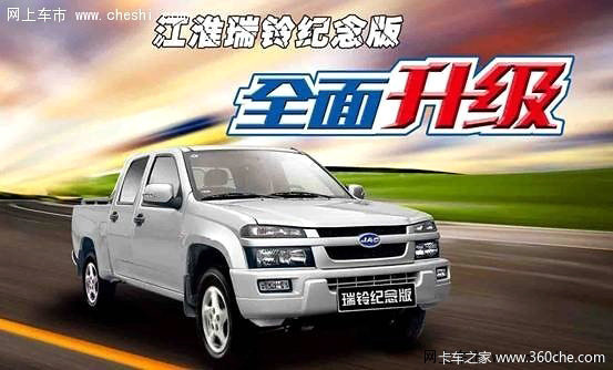 江淮瑞铃纪念版在原有车型基础上,创新升级2014款内饰、货箱宝、铝轮毂、外绳钩等实用、超值配置,意在用更丰富的配置和实惠的售价汇报广大皮卡消费者。江淮瑞铃纪念版皮卡的上市,将会改变国内中端皮卡市场竞争新格局,引爆新一轮的皮卡大战!
