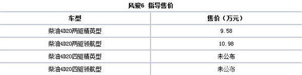 4月16日,长城汽车风骏6正式上市,新车共计4款,目前官方仅公布了柴油两驱精英型、两驱领航型的售价,依次为9.58万元、10.98万元。
