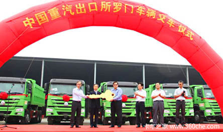 近日,中国重汽数十辆绿色涂装HOWO卡车在济南批量交付所罗门客户,所罗门客户代表从中国重汽进出口公司杨正旭手中接过象征合作与财富的巨型金钥匙。