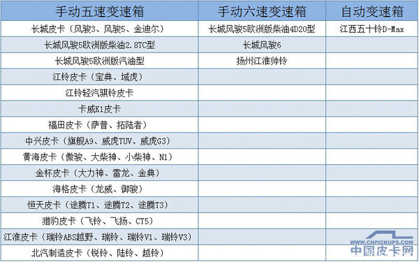 国产皮卡中多数都是手动皮卡,并且大多数都是手动五档变速箱。但是长城风骏5欧洲版柴油4D20型皮卡、长城风骏6皮卡、江淮帅铃皮卡这几款皮卡是六档变速箱。另外,江西五十铃的D-Max将推出匹配自动变速箱的车型。