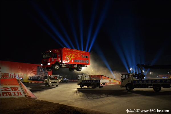 “卡车斜坡飞跃最远距离”的挑战项目,是对卡车操作性、底盘扎实性、整车安全性等综合性能的考验。如果车辆品质、操控性能达不到标准,卡车从一个斜坡上面飞跃起来,可能落不到对面斜坡,即使成功飞跃,经过高强度震动、颠簸,车架会出现扭曲、断裂等问题。然而,大运重卡不负众望,“毫发无伤”地轻松飞跃并落至26米处以外,经受住了强大冲击力的考验。大运重卡综合性能之强,令所有观众震撼不已。