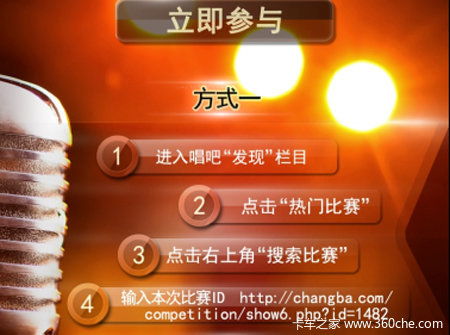 据了解,本次活动将面向所有喜爱音乐的人士开放,不限年龄,不限唱法,不限形式,只要喜欢音乐,并希望展示自己的选手即可参加。本次活动一汽-解放摒弃了繁琐的报名和参赛流程,活动开始后,参赛选手只需在手机上安装“唱吧”软件,然后在“发现”栏目“热门比赛”中点击“解放好声音”页面;或在“热门比赛”中搜索“解放好声音”,即可参与活动;或直接点击以下链接:http://changba.com/competition/show6.php?id=1482也可直接参与活动。所有录制下属于你的“解放好声音”,或关注一汽解放微信号:jiefangfaw的歌友就有机会赢得《中国好声音 》录制现场门票,苹果ipod 等众多大奖。