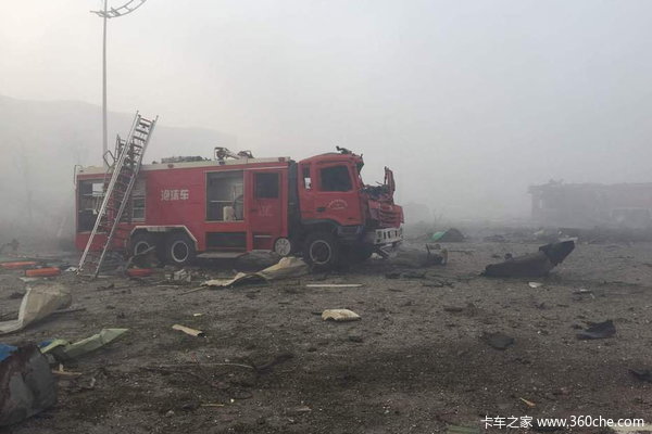 这辆6X4的泡沫消防车驾驶室看样子是在爆炸的时候被什么飞来砸到了