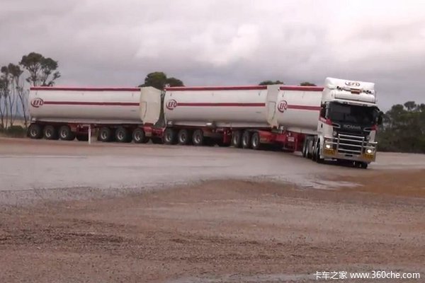 在澳大利亚,由于特殊的地理位置,再加上铁路建设费用较为昂贵,又为了增加道路运输的效率,聪明的澳洲人想出了一个好办法,就是在牵引车后面挂多个车厢,形成一列长长的“火车”,这类车被称为“公路列车”。