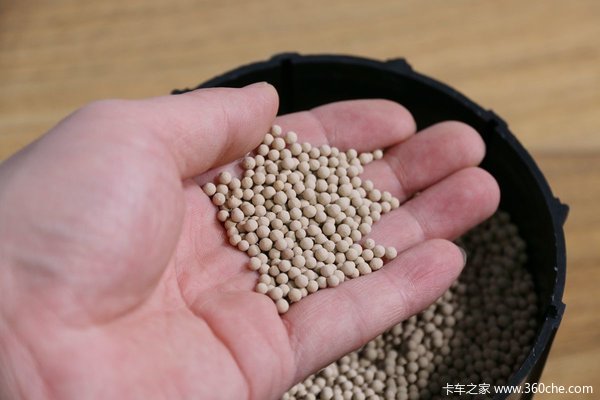 打开盖子之后,这个干燥罐真正的核心部分,干燥剂终于展现在了我们的面前,用手抓了一些出来发现颗粒比较细小,太像某种豆子了,而我的同事则认为这玩意像猫屎。