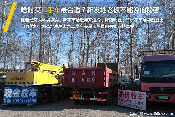 【卡车之家 原创】经常跑货的司机都知道,在北京丰台区南四环与京沈开高速交口东南角马家楼桥附近有一个大名鼎鼎的新发地。新发地始建于1988年,起初只是一个15个人、15亩地的小型农贸市场。经过近30年的发展,现已成为北京市交易规模最大的物流集散中心和运输基地,在全国同类市场中也具有很大的影响力。在此过程中,周围也相应带动起4S专卖店、汽车城、旧车交易等行业的发展。近日笔者走访了其中一个二手车交易市场,收获还不少。