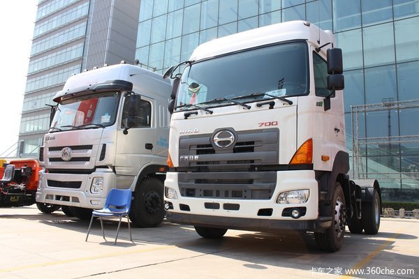 本次展会最亮眼牵引车当属一汽解放,解放本次总共展出了四款车型,都采用了喜庆的红色车身涂装,展车包括了解放6X2牵引车、解放JH6 6X4牵引车、6X2悍V的天然气牵引车以及J6F 4X2的载货车。除了解放的牵引车外,在室外的展车中还有四川现代创虎、广汽日野、北奔重卡V3、三环御龙的牵引车。