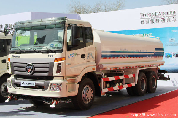 福田除了展出了两款欧马可轻卡系列改装的专用车外,欧曼ETX重卡系列也位列其中。刚走进展馆园区,我们第一眼就看到了一款由欧曼ETX 6系6×4 LNG洒水车,型号为BSZ5253GSSL5,这款车身采用欧曼ETX-2490平顶车身改装而成,配备潍柴9.7升WP10NG336E50发动机,采用天然气(LNG)为燃料,可以达到国V排放标准。