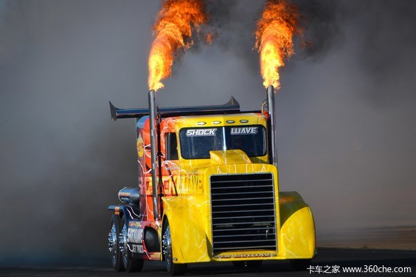 【卡车之家 编译】敢与战斗机叫板加速的超跑不稀罕,能与飞机叫嚣的重卡很少见。在美国航展上,你没有听错,不是车展,不会飞的擎天柱表示这只是小菜一碟。36000马力,最高时速554公里,重度改装的彼特比尔特喷着火龙呼啸而至。
