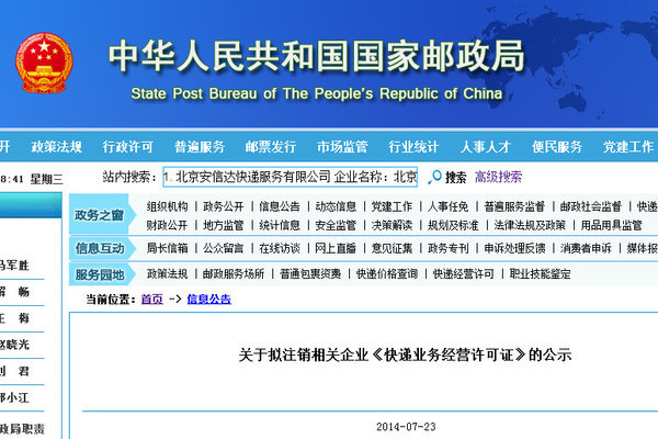 2016年6月7日,国家邮政局针对此现象拟注销三家快递企业的业务经营许可证,并发布“关于拟注销相关企业《快递业务经营许可证》的公示”。内容如下: