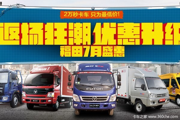 【卡车之家 原创】“返场狂潮 优惠升级”福田7月盛惠即将开启,活动时间为7月18日21:00-8月10日23:59。届时将有秒杀车型、卡友福利站、砍价再优惠和一口价四种活动同时登场,为需要购车的卡友送去真真正正的实惠。
