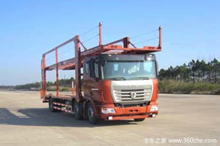 该车辆运输车是在联合卡车U系底盘的基础上改装而成的,上装部分能够装载乘用车。底盘采用了6X2的驱动方式,在动力性方面搭载了玉柴型号为YC6L290-50的国五发动机,最大输出功率为290马力,用于商品车的运输正合适。