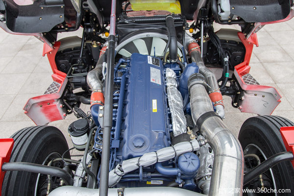 此辆车搭载的WP10H发动机是潍柴新开发的具有完全自主知识产权的新一代柴油发动机,缸径116毫米,活塞行程150毫米,排量9.5升,功率375马力。最大扭矩转速区间1000-1400转,在这个转速区间范围内可以输出1900牛米的最大扭矩,燃油消耗率185克每千瓦时。整机采用了高可靠性设计,B10寿命达到了惊人的180万公里/30000工作小时。