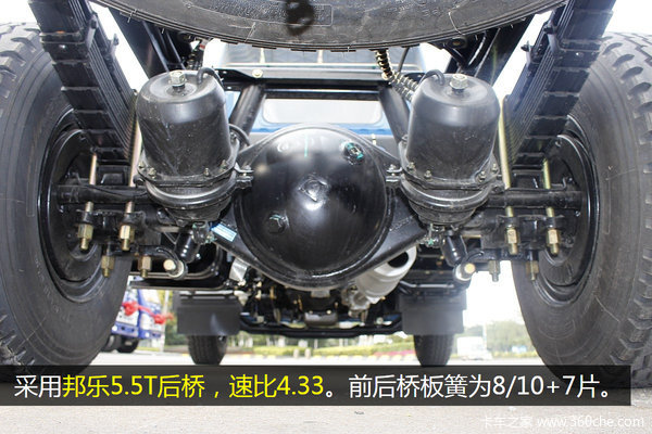 前后桥均采用了多片簧设计,提升车辆的承载性能。采用邦乐5.5吨级后桥,速比4.33。目前我国的轻卡产品普遍采用的是3.5吨级后桥与5吨级后桥,多利卡D6的5.5吨级算得上是载重量较高的后桥产品了。