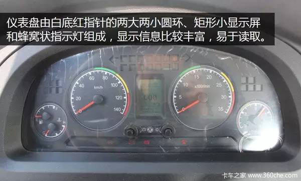 仪表盘由白底红指针的两大两小圆环、矩形小显示屏和蜂窝状指示灯组成,显示信息比较丰富,易于读取。其中,仪表盘中间的小显示屏可显示时间、电源电压、车速、机油压力、尿素液位等信息。