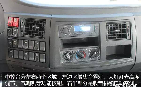 中控台分左右两个区域,左边区域集合雾灯、大灯灯光高度调节、气喇叭等功能按钮。右半部分是收音机和自动空调。