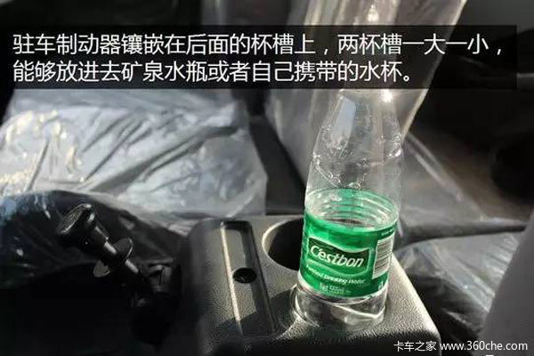 储物空间方面,车门上设计的储物槽,可容纳一瓶矿泉水。驻车制动器镶嵌在后面的杯槽上,两杯槽一大一小,能够放进去矿泉水瓶或者自己携带的水杯。