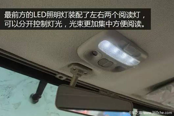 车顶有设置了三个LED照明灯,负责驾驶室整体的照明,同时最前方的LED照明灯装配了左右两个阅读灯,可以分开控制灯光,光束更加集中方便阅读。