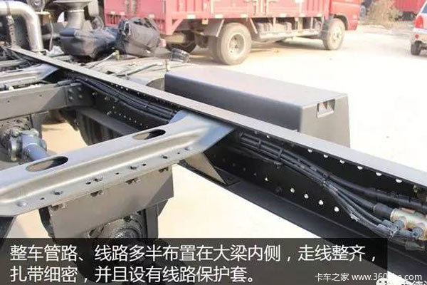 整车管路、线路多半布置在大梁内侧,走线整齐,扎带细密,并且设有线路保护套,增加线路使用寿命。