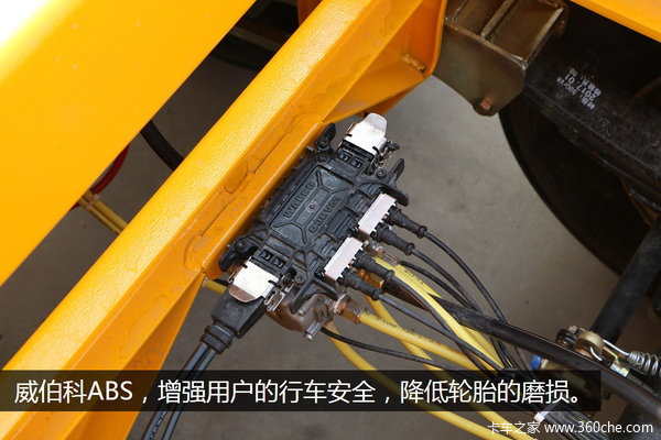 悬挂采用的是少片簧,在保证承载能力的前提下降低车辆自重。这款挂车使用的是威伯科ABS,能大大增加用户的行车安全,降低轮胎的磨损。除此之外,该车的制动阀、泵均采用的是名优产品。