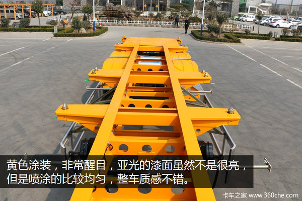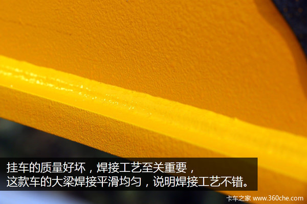 在黄色的面漆下面是电泳底漆,这款挂车采用了电泳工艺,在抛丸除锈后,挂车会进行电泳。通过电泳后会有一层电泳漆,电泳漆将大大增强了挂车的防腐蚀能力,据称锣响是国内首家进行挂车大梁整体电泳的厂家。